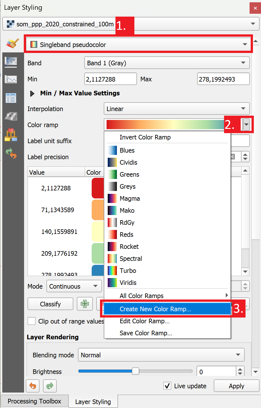 Singleband Grayy cambie aSingleband Pseudocolour.Haga clic en la flecha situada a la derecha de la rampa de color. Aquí puede elegir una rampa de color predefinida.