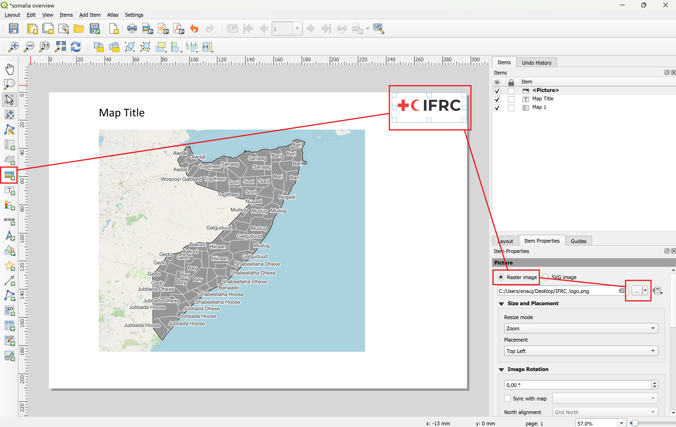 En la pestaña “Item Properties”, tendrá la opción de elegir una imagen SVG de su biblioteca SVG en QGIS o elegir una imagen ráster. La mayoría de los archivos de imagen son imágenes ráster.