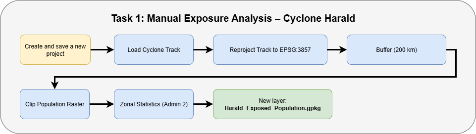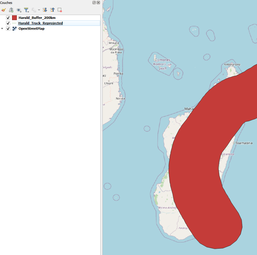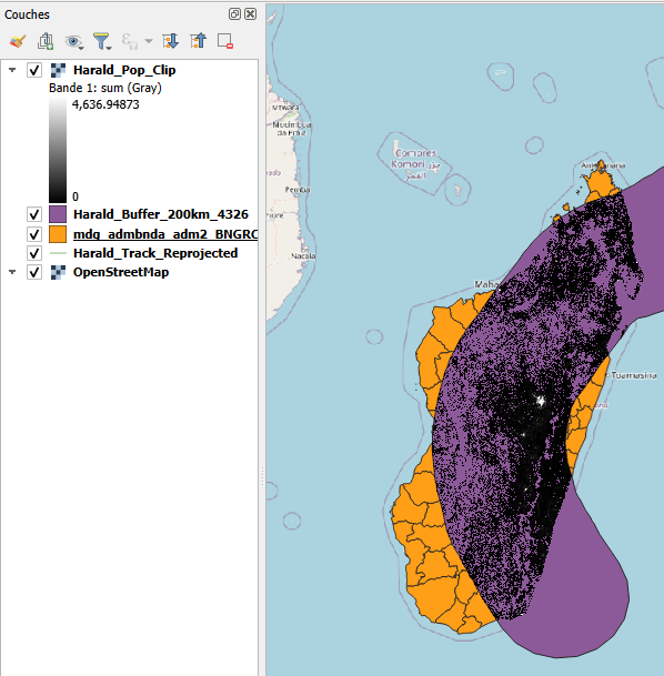 Antes de diseñar el modelo automatizado, Aina solía estimar manualmente la población expuesta cada vez que un ciclón se acercaba a Madagascar. En esta tarea, seguirá los pasos que ella utilizó en el pasado trabajando con el registro histórico del ciclón Harald, los datos ráster de WorldPop y los límites administrativos.