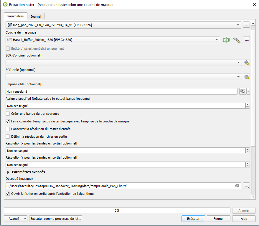 Recorte el ráster de población utilizando la zona buffer de impacto: