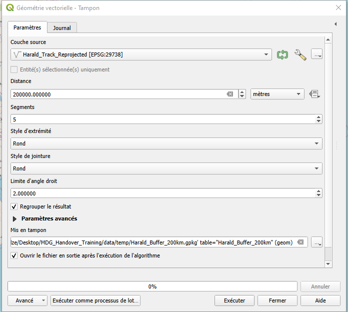 Guarde el resultado en la carpeta temporal como: Harald_Buffer_200km_4326