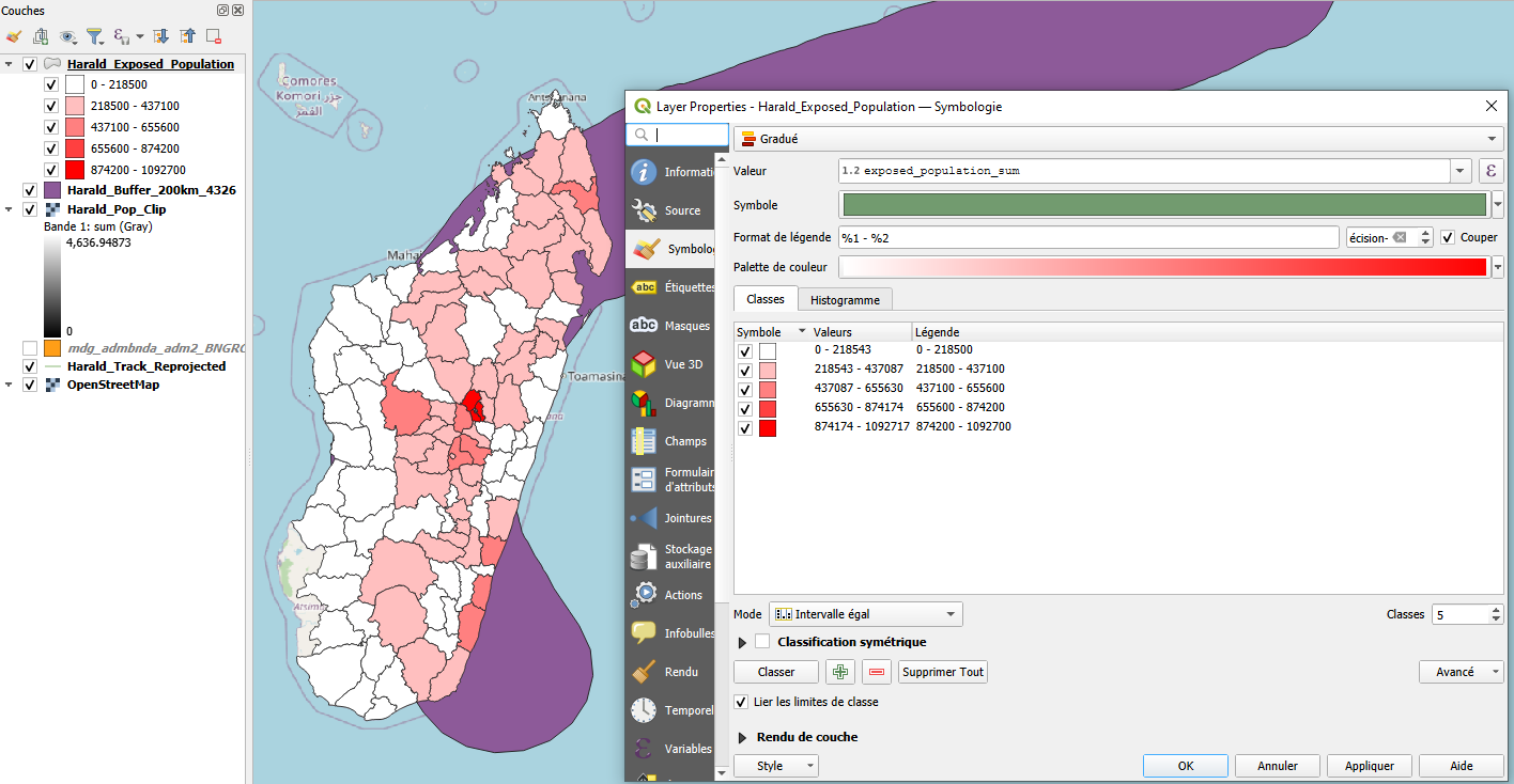Visualice la población afectada clasificando los resultados: Ahora que Aina ha estimado la población expuesta en cada distrito, quiere mostrar claramente las diferencias entre las regiones en el mapa. Para ello, aplicaremos una clasificación graduada a la capa
