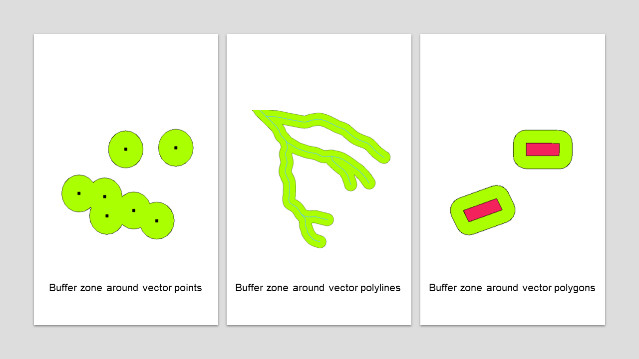 La creación de zonas de influencia crea zonas de distancias predeterminadas alrededor de las entidades geométricas como una nueva capa de polígono. Estas zonas de influencia rodean las entidades vectoriales de entrada. Esta zona de influencia suele ser uniforme y se extiende hacia afuera desde las entidades de entrada originales, lo que la hace útil para diversos análisis espaciales y aplicaciones cartográficas. Se pueden crear estas zonas alrededor de puntos, líneas y polígonos, como se muestra en Fig. 5.12.
