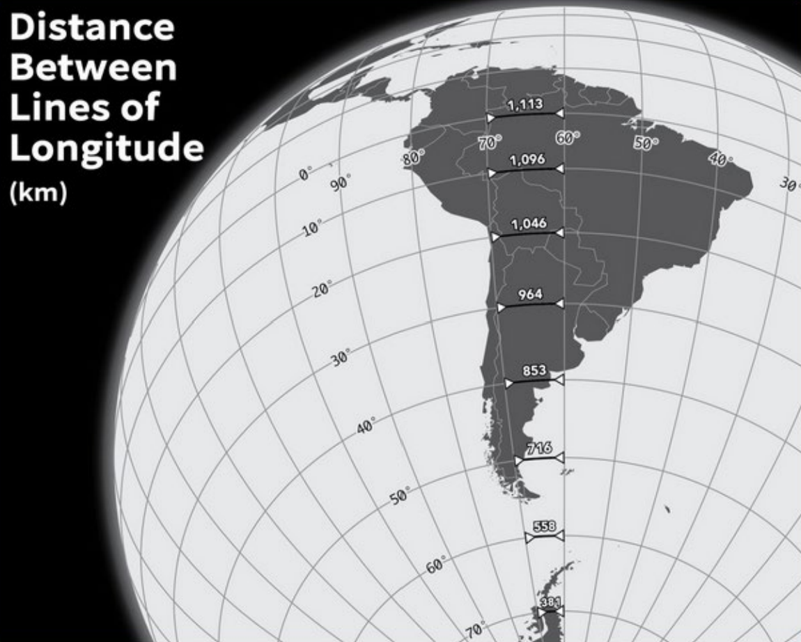 Fig. 5.14 Esta imagen ilustra esto: 10 grados de longitud en el ecuador son 1113 km, pero 10 grados de longitud a 70 grados de latitud son solo 381 km. (Fuente: Ricky Angueria).#