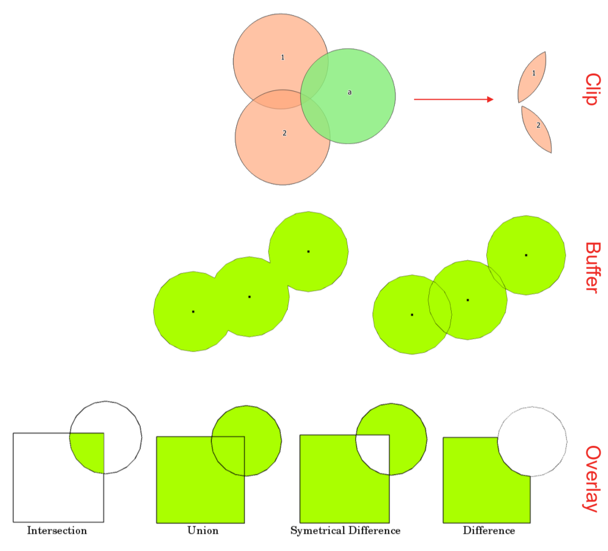 Las operaciones de superposición nos permiten combinar las geometrías de dos capas de diferentes maneras (véase Fig. 5.9).