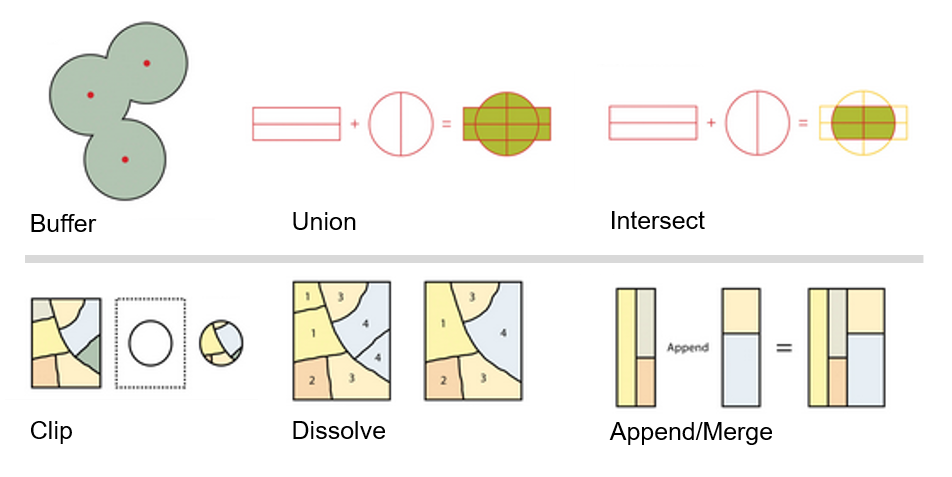 Fig. 5.1 Distintas herramientas de geoprocesamiento espacial. Fuente: Adaptado de Saylor Academy#