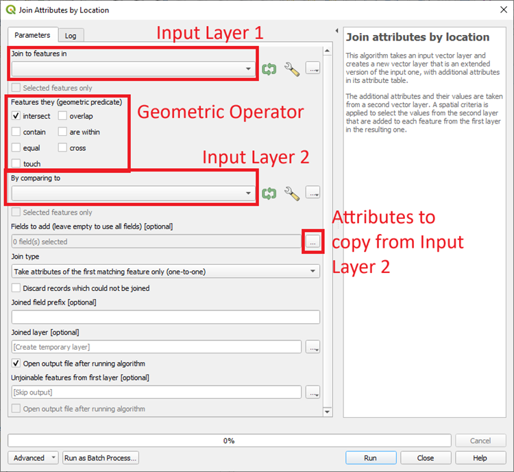 Por defecto, QGIS proporciona tres herramientas diferentes para realizar uniones espaciales.
