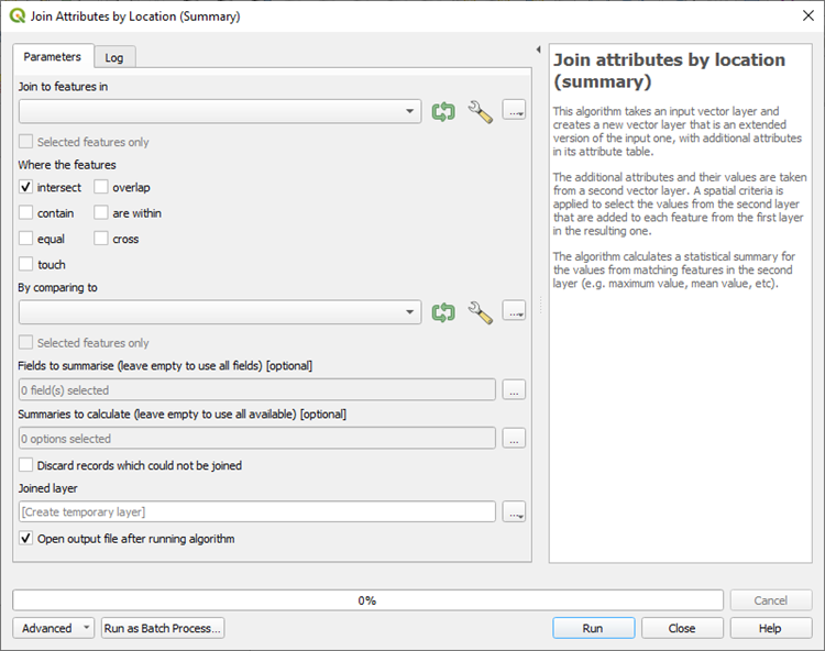 Esta herramienta es similar a la herramienta “Unir atributos por ubicación”. Sin embargo, además de añadir los atributos de una capa a otra, este algoritmo también calcula resúmenes estadísticos de los valores de las entidades coincidentes en la segunda capa. Estos resúmenes incluyen una amplia gama de opciones, como valores mínimos y máximos, valores medios, así como recuentos, sumas, desviación estándar, y mucho más.