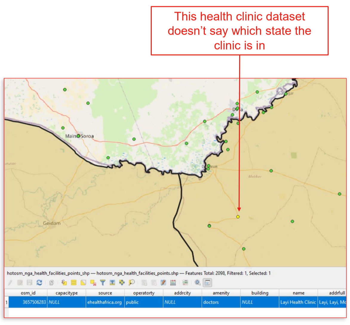 En el ejemplo anterior (Fig. 5.4), tenemos un conjunto de datos que contiene el conjunto de datos de centros de salud por healthsite.ioand con los límites administrativos (adm2) de Nigeria. Queremos saber en qué estado se encuentra cada centro de salud. Para ello, debemos utilizar la herramienta “Unir atributos por ubicación”.