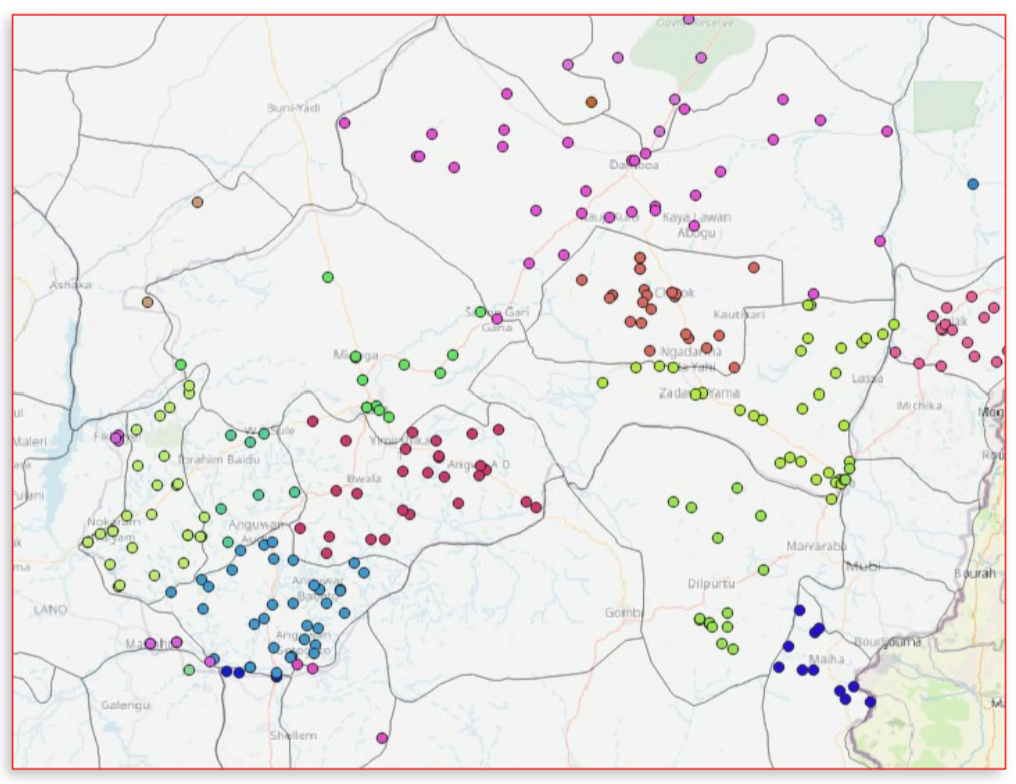 Enhorabuena, ¡ya hemos añadido la información sobre la región administrativa a la capa de centros de salud! Podemos simbolizar la capa unida con la simbología categorizada para comprobar si ha funcionado (véase Fig. 5.6). Obsérvese que los puntos del conjunto de datos original que estaban fuera de la frontera de Nigeria se han descartado, ya que no se han podido unir.