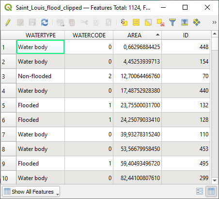 Saint_Louis_flood_clipped(columna Watertype), verá que la capa incluye zonas inundadas, no inundadas y masas de agua.