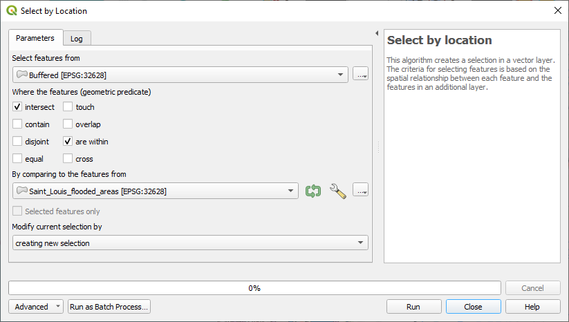 Select by locationpara evaluar qué zonas de influencia se intersecan con las zonas inundadas.