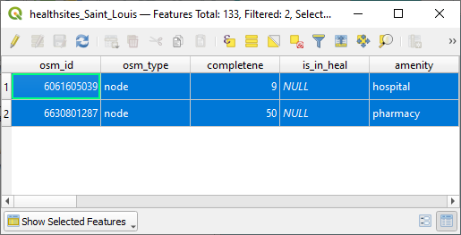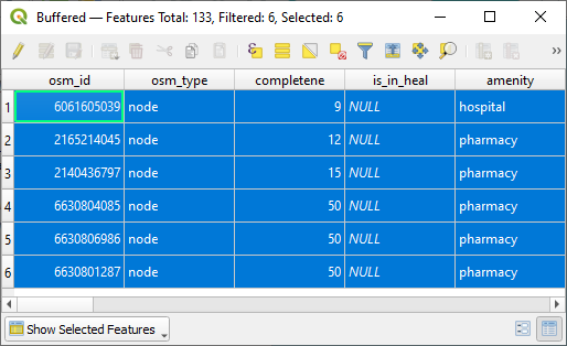 ¿Cuántos centros de salud se seleccionaron? Compruebe la tabla de atributos. La selección debe incluir cinco farmacias y un hospital.