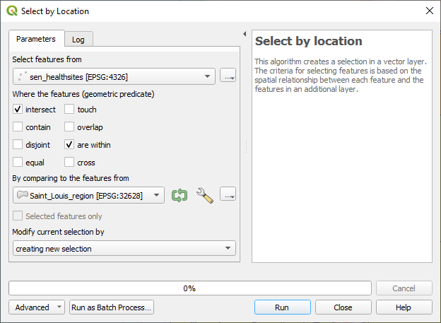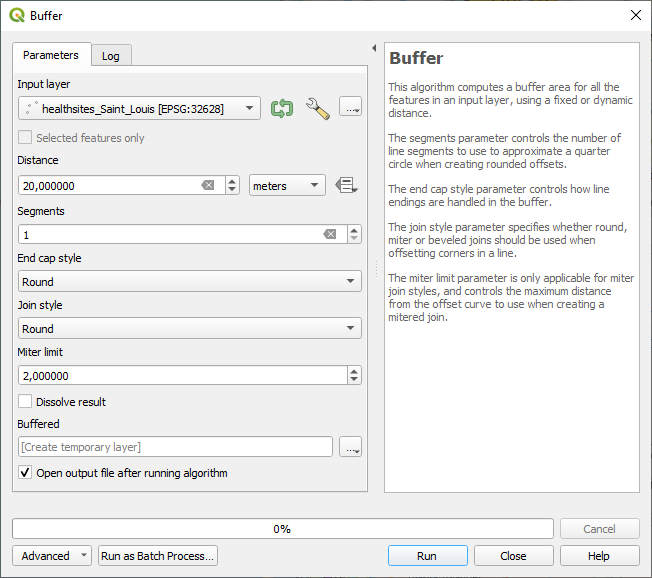 A más tardar en esta fase, recibirá un recordatorio de que debe reproyectar las capas. Las zona de influencia significativas solo pueden calcularse en sistemas de coordenadas proyectadas. El sistema de coordenadas previsto para Senegal es EPSG:32628 WGS 84 / UTM zone 28N