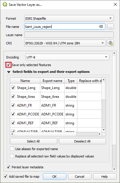 Saint_Louis_regionen una capa adicional. Para ello, haga clic con el botón derecho en la capa límite –>Export–>Save Selected Features As...