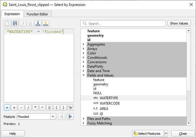 Select by expressionpara seleccionar todas las zonas inundadas en la capaSaint_Louis_flood_clipped. Puede acceder a esta herramienta a través de la tabla de atributos haciendo clic en este símbolo