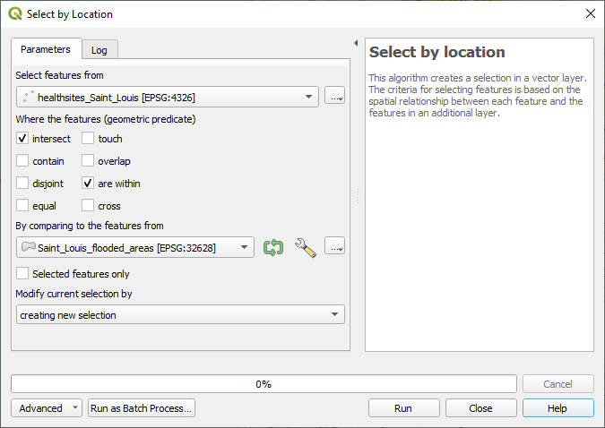 Select by locationpara evaluar qué centros de salud son propensos a las inundaciones por estar situados dentro de las zonas inundadas de San Luis (sugerencia: Seleccione las entidades de:healthsites_Saint_Louis; comparando con:Saint_Louis_flooded_areas).