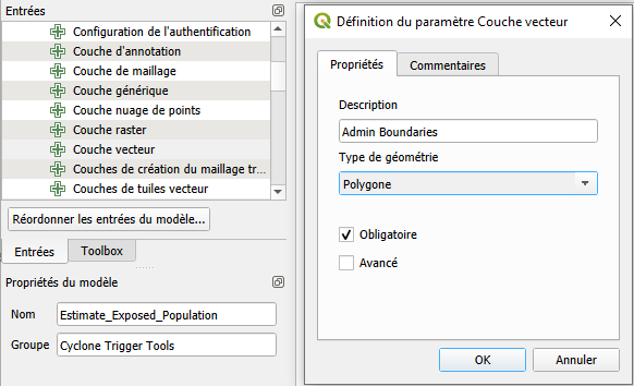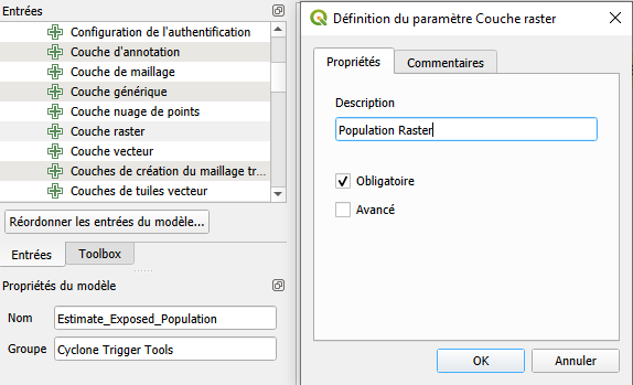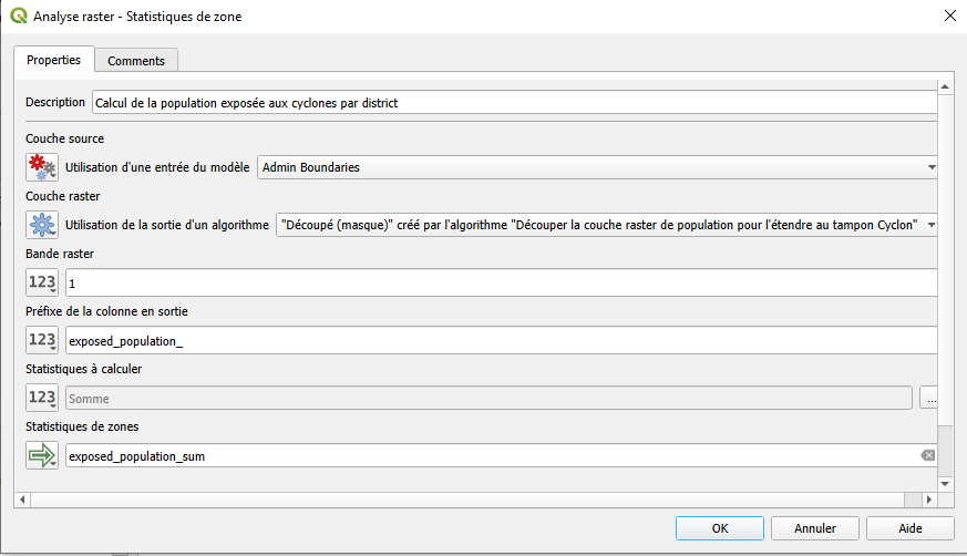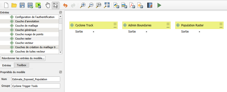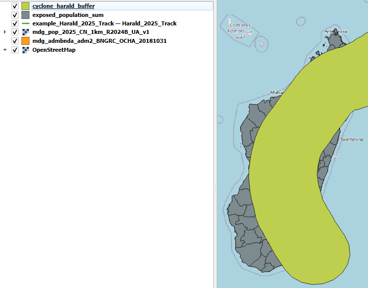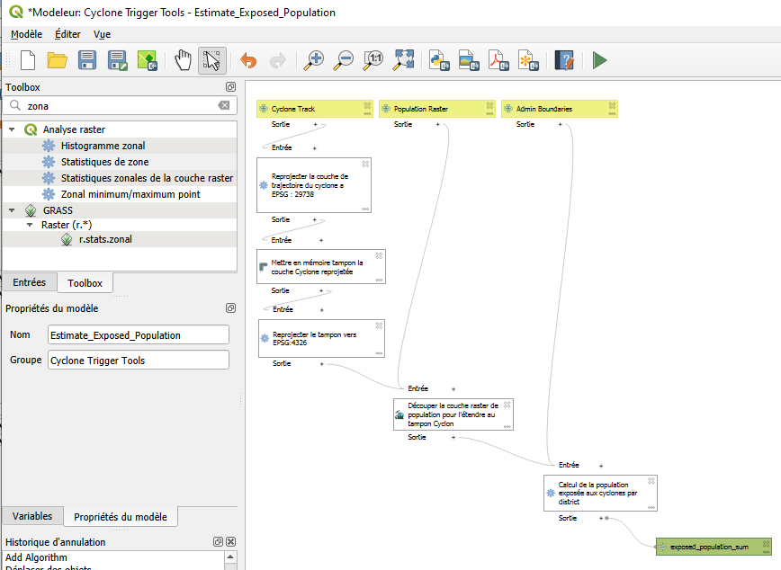 Tras estimar manualmente las poblaciones expuestas en temporadas ciclónicas anteriores, Aina decidió preparar un modelo automatizado utilizando el modelador gráfico QGIS. Esto la ayudará a actuar con mayor rapidez y evitar la repetición manual de los mismos pasos cada vez que se prevea un ciclón.
