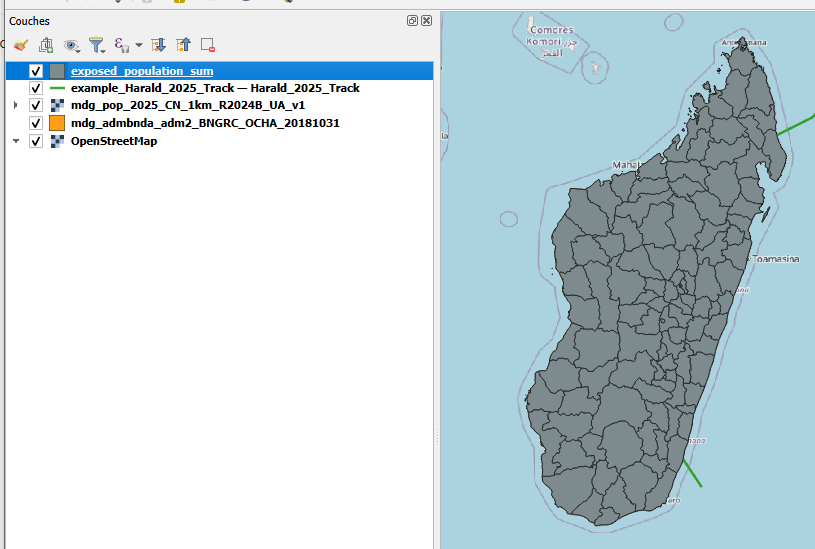 Objetivo del ejercicio: Aina, experta en SIG de la Cruz Roja Malgache (CRM), se prepara para la próxima temporada de ciclones. Quiere mejorar la capacidad de su equipo para actuar con rapidez una vez pronosticada una tormenta automatizando los análisis clave en QGIS. Esto incluye la estimación de las poblaciones expuestas, la identificación de los servicios afectados como la sanidad y la educación, y la evaluación de si se puede llegar a los puestos sanitarios desde los almacenes clave en un plazo crítico de 10 horas. El objetivo es preparar un flujo de trabajo de análisis y visualización de principio a fin que pueda respaldar una acción anticipatoria rápida y basada en datos antes de que un ciclón toque tierra.