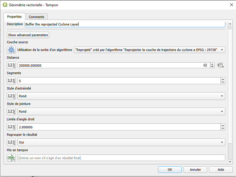 Reprojectar la capa de la trayectoria del ciclón a EPSG : 29738Configure la Capa de entrada a