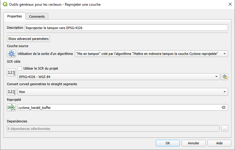 Haga doble clic en el algoritmo del paso 7 (Reproyectar el buffer de nuevo a EPSG:4326) para abrir su configuración.