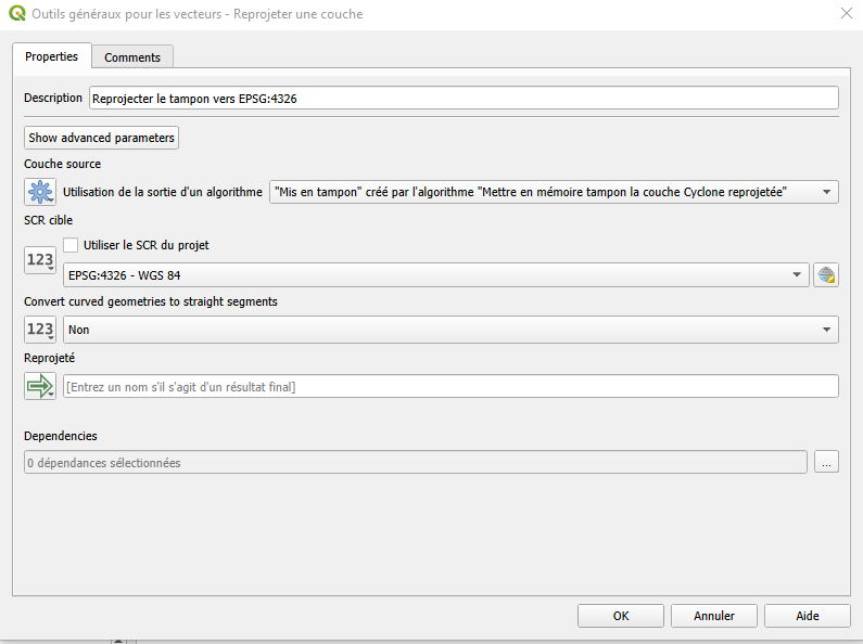 EPSG:4326 – WGS 84.Configure la salida como Salida del modelo (deje el nombre de la salida en blanco ).