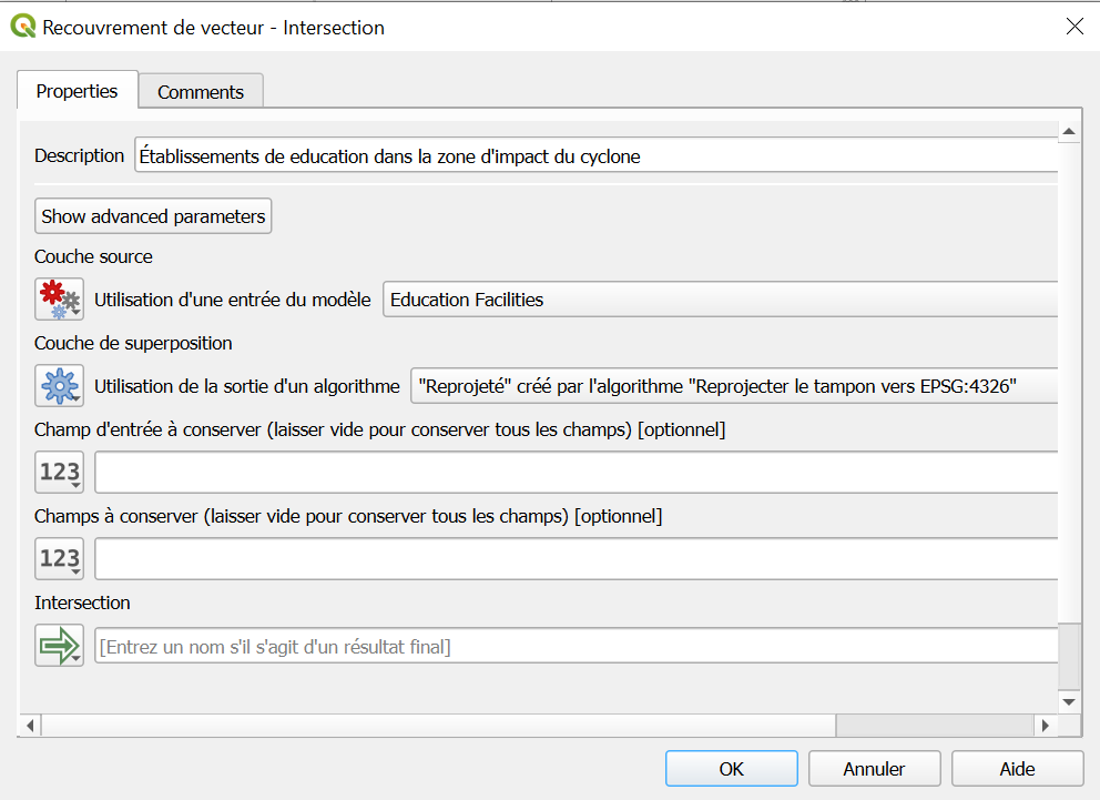 Trayectoria del ciclón→ seleccione el GeoJSON de la trayectoria de la tormenta (por ejemplo,Harald_2025_Track.geojson).Ráster de población→ seleccione el archivo ráster WorldPopLimites administrativas→ seleccione la capa Admin 2 (por ejemplo,MDG_adm2.gpkg)Centros de salud→ seleccione el conjunto de datos de puntos para los centros de salud.Establecimientos educativas→ seleccione el conjunto de datos de puntos para las escuelas
