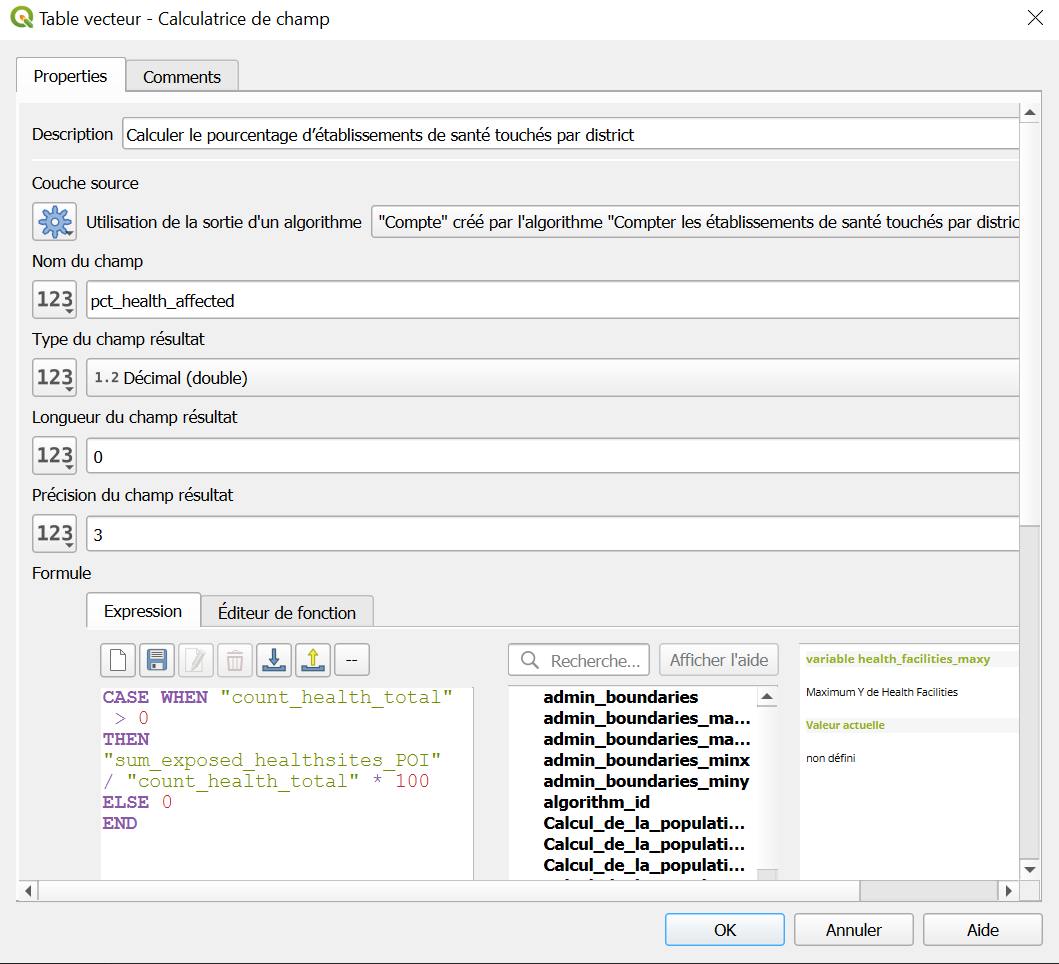 Résultats du modèle de la tâche 3 affichés dans QGIS, y compris les pourcentages d’établissements de santé et d’éducation touchés par district.#