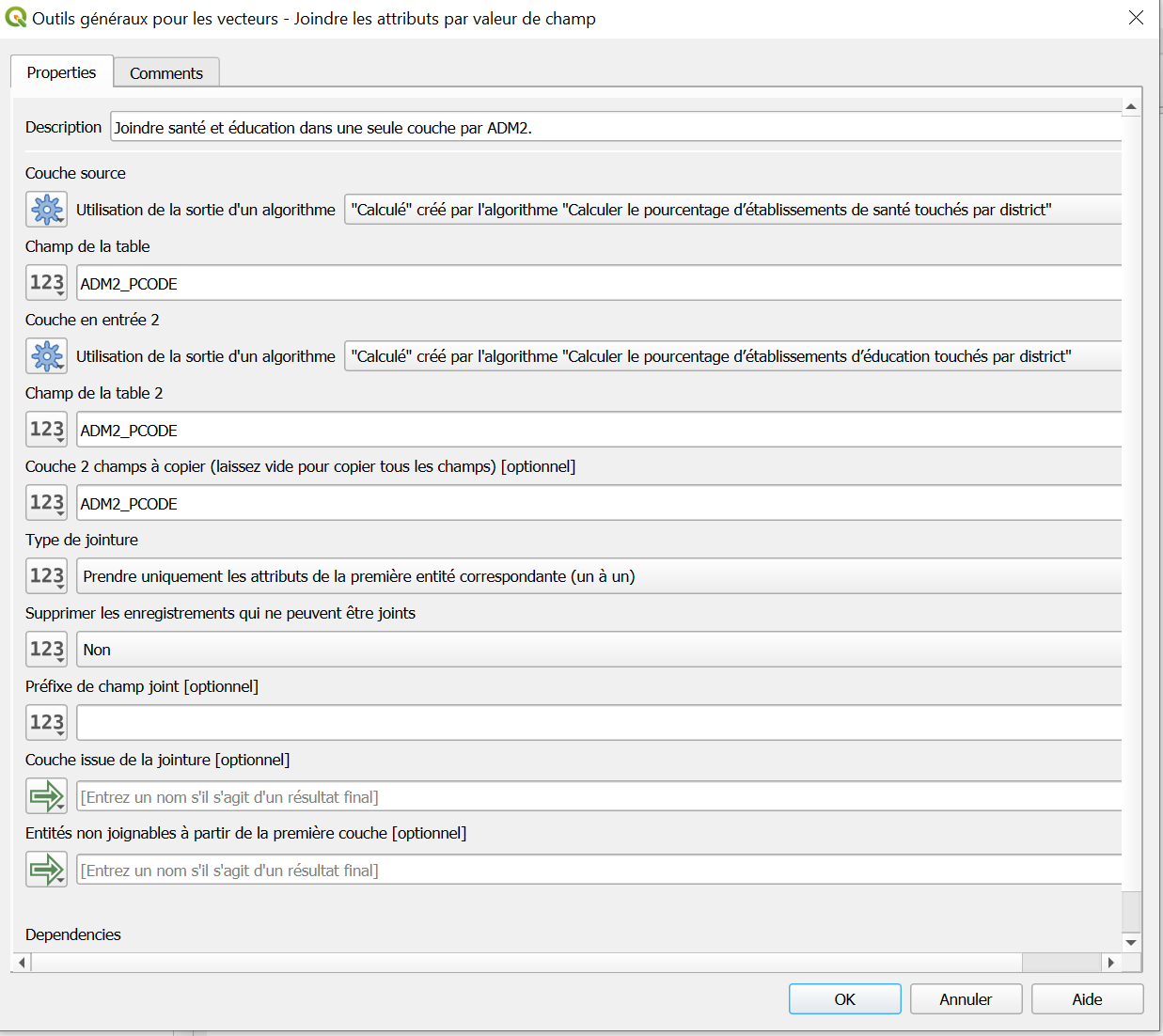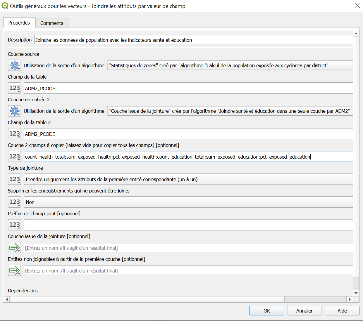 Configuración de la operación: unir los datos de salud y educación mediante el campo ADM2_PCODE para combinar los resultados en una sola capa.#