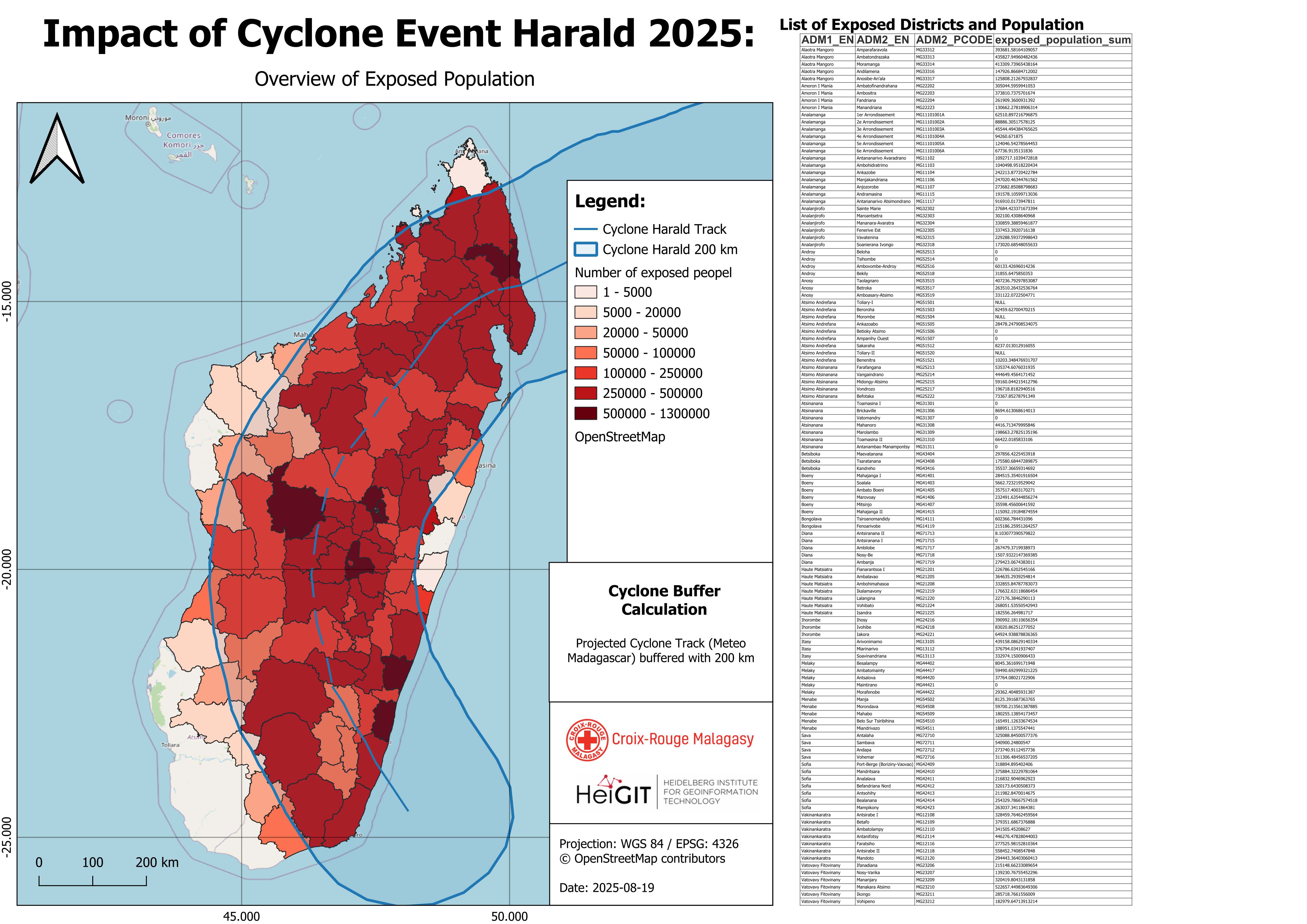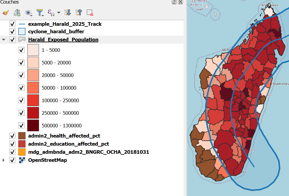 Objetivo del ejercicio: Aina, experta en SIG de la Cruz Roja Malgache (CRM), se prepara para la próxima temporada de ciclones. Quiere mejorar la capacidad de su equipo para actuar con rapidez una vez pronosticada una tormenta automatizando los análisis clave en QGIS. Esto incluye la estimación de las poblaciones expuestas, la identificación de los servicios afectados como la sanidad y la educación, y la evaluación de si se puede llegar a los puestos sanitarios desde los almacenes clave en un plazo crítico de 10 horas. El objetivo es preparar un flujo de trabajo de análisis y visualización de principio a fin que pueda respaldar una acción anticipatoria rápida y basada en datos antes de que un ciclón toque tierra.