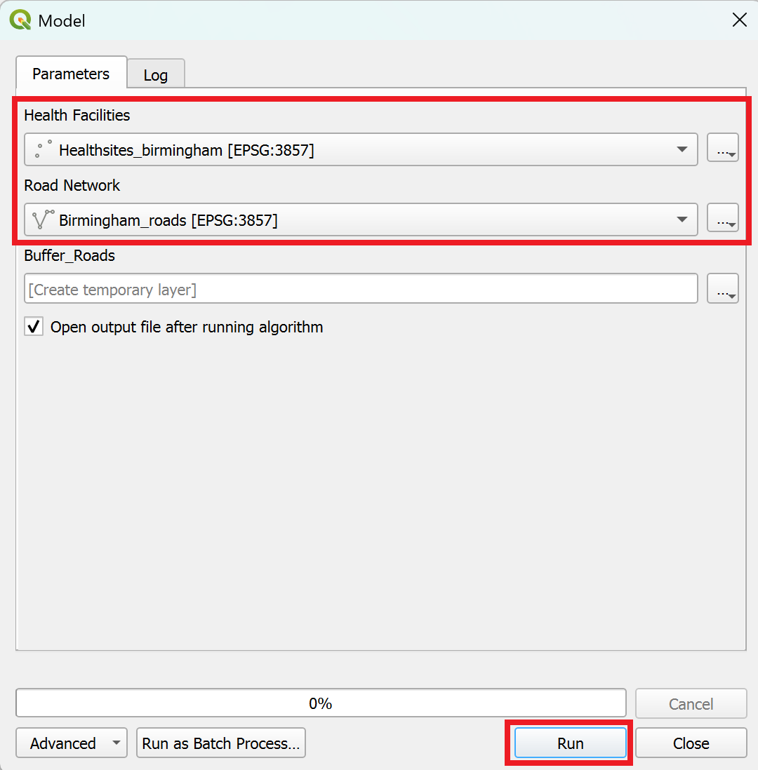 Para ejecutar el modelo, haga clic en la flecha verde de la barra superior; se abrirá una nueva ventana en la que deberá ingresar/especificar las entradas y, a continuación, haga clic en “Run” para ejecutar. Las capas de salida se añaden automáticamente a la interfaz de su proyecto en QGIS.