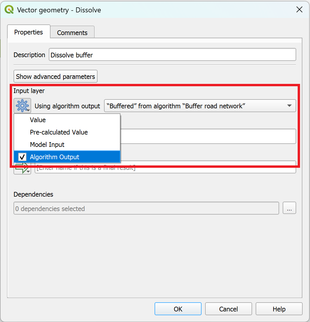 Una vez añadido, se abrirá la ventana de parámetros del algoritmo. Tendrá un aspecto similar al de la ventana normal de parámetros de ese algoritmo, con algunas excepciones: