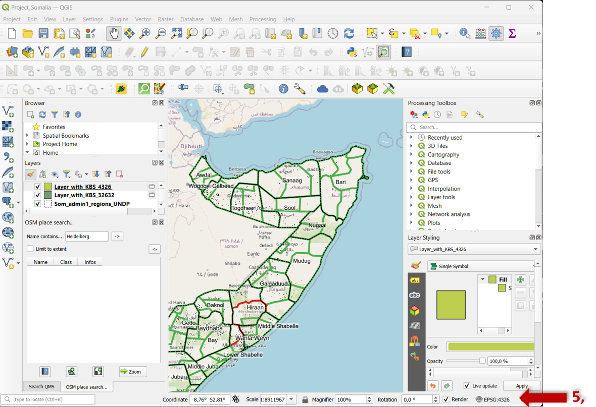 Compruebe y ajuste las capas: después de redefinir el sistema de coordenadas, es esencial comprobar las capas para asegurarse de que se alinean correctamente. Algunas capas pueden requerir ajustes manuales o una reproyección si no se alinean como se esperaba. Vuelva a revisar la parte inferior derecha de la ventana de QGIS, donde se indica el SRC real.
