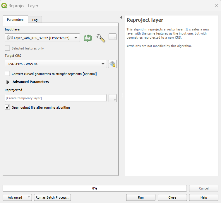 Reproyección: Si hay dos capas con diferentes SRC, seleccione una de las capas como capa de entrada que tenga, por ejemplo, el SRC EPSG:32632 - WGS 84, y defina como SRC de destino EPSG:4326 - WGS 84. Al ejecutar el algoritmo obtendrá una nueva capa, idéntica a la capa de entrada, pero con un SRC diferente.