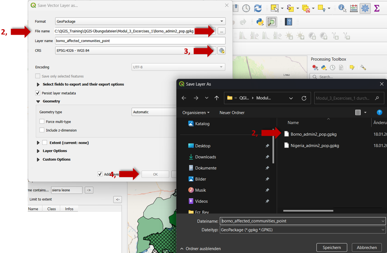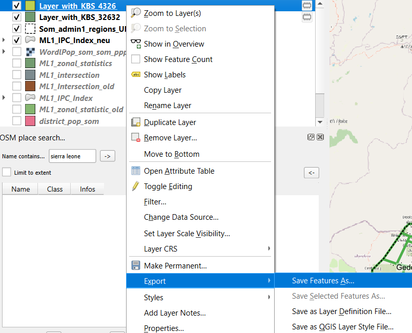 A menudo se producen errores si se establece el SRC y no se ha utilizado ninguna herramienta de reproyección. Si sospecha de que su reproyección ha salido mal, borre todas las capas afectadas de QGIS, vuelva a cargar los datos y, a continuación, reproyéctelos y expórtelos.