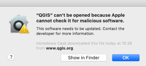 Al abrir QGIS por primera vez en Mac puede aparecer este mensaje de error: