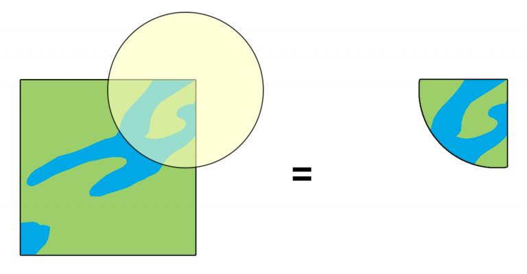 Fig. 15 Intersection Operación entre una capa de entrada de dos entidades y una sola capa de superposición de entidades (izquierda): las entidades resultantes se mueven para mayor claridad (derecha). Fuente: GISGeography.com#